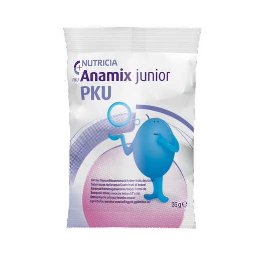 PKU Anamix junior Berry is a Food for Special Medical Purposes for use under medical supervision. PKU Anamix junior is a phenylalanine free powder drink mix containing a balanced mixture of the other essential and non-essential amino acids, carbohydrate, fat (including docosahexaenoic acid (DHA)), vitamins, minerals, trace elements and fibre. With sugar and sweetener (except neutral flavour). For the dietary management of proven phenylketonuria in children aged one to ten years.