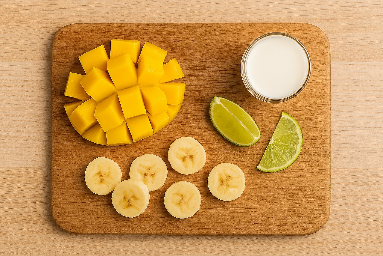 - Put the Loprofin drink LQ, mango, banana and the juice of half a lime in a blender or food processor.