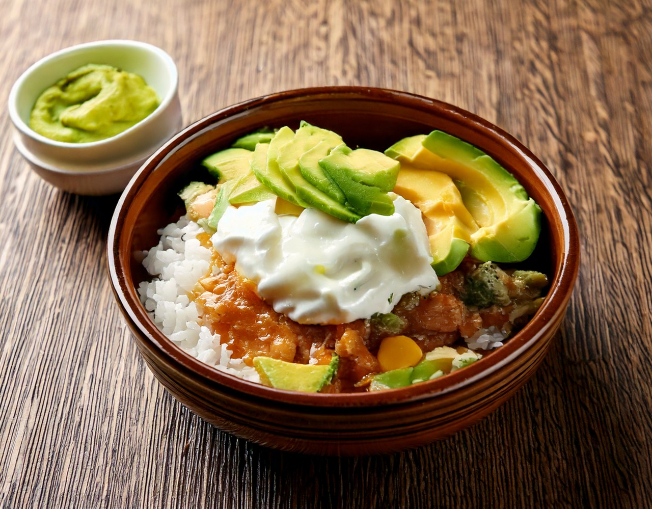 - Serve with rice, avocado, yogurt, cheese and coriander.